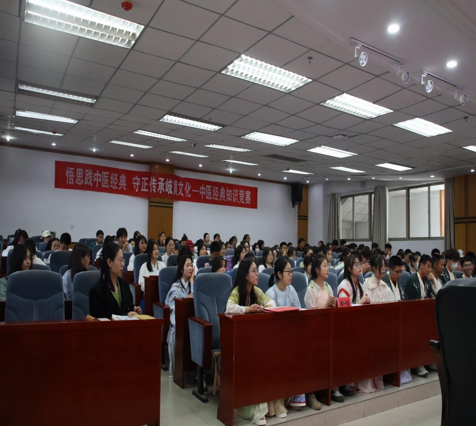 随后,由8个比赛队伍分别进行自我介绍,他们身着传统服装,焕发着自信,将在这个舞台上一决高下。接着,选手们共完成了四轮精彩的答题,现场气氛热烈。本次中医经典知识竞赛活动不仅检验了同学们扎实的中医经典知识功底,还体现出了他们团结合作的精神。最后,到场嘉宾与所有参赛选手进行合影留念,此次中医经典知识竞赛在掌声中完美谢幕。